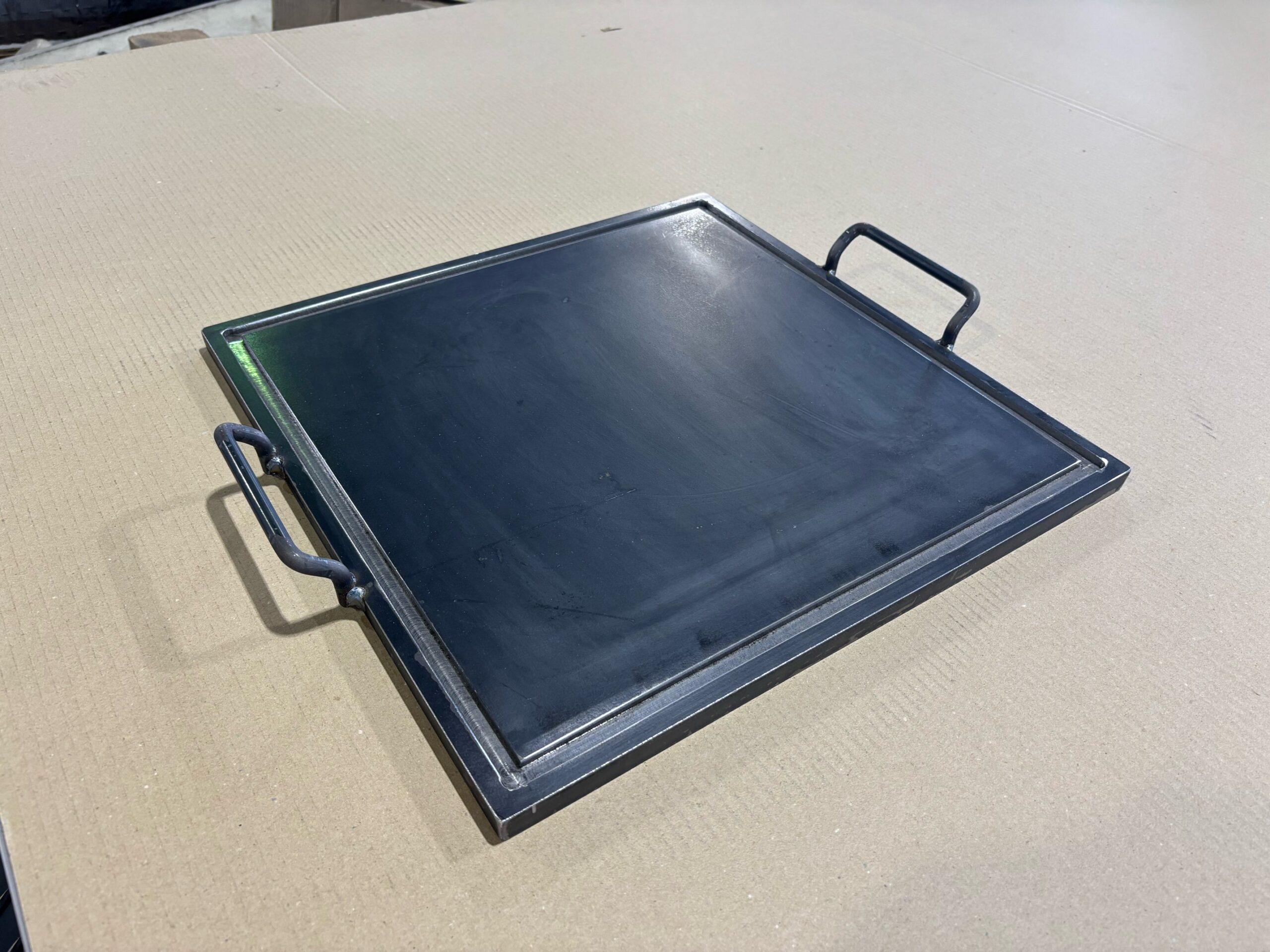 「調理中に具材を入れた時に鉄板の温度が下がりにくいようにしたい」というご要望があり、22mmという極厚鉄板で製作しました。さらに、「鉄板の周囲4面に幅10mm×深さ5mmの溝を掘ってほしい」という追加のご要望がありましたが、可能な限り短納期で対応いたしました。